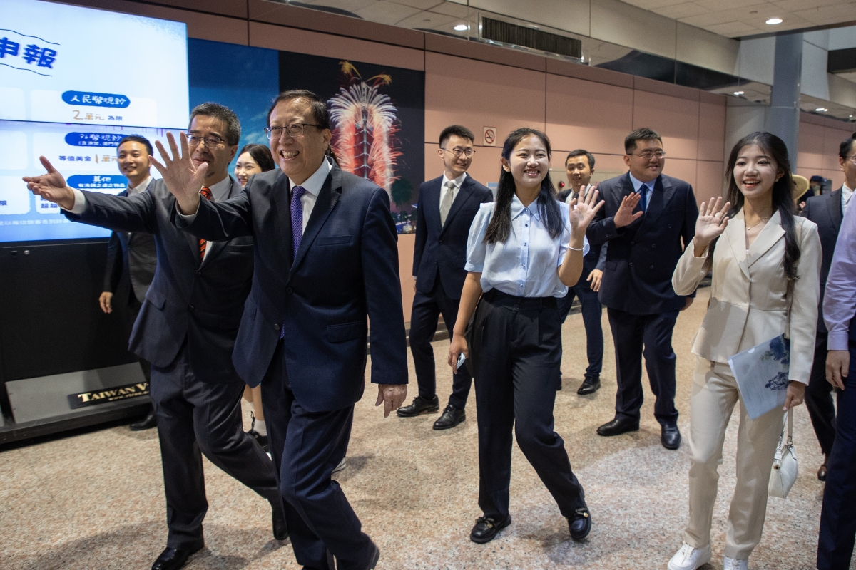 北大書記郝平率大陸高校36名師生15日抵達桃園機場。 香港中通社圖片