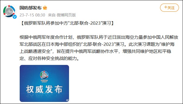 香港新聞網7月15日電 據國防部官方微博“國防部發佈”15日的消息,根據中俄兩軍年度合作計劃,俄羅斯軍隊將於近日派出海空力量參加中國人民解放軍北部戰區在日本海中部組織的“北部·聯合-2023”演習。此次演習課題為“維護海上戰略通道安全”,旨在提升中俄兩軍戰略協作水平,增強共同維護地區和平穩定、應對各種安全挑戰的能力。