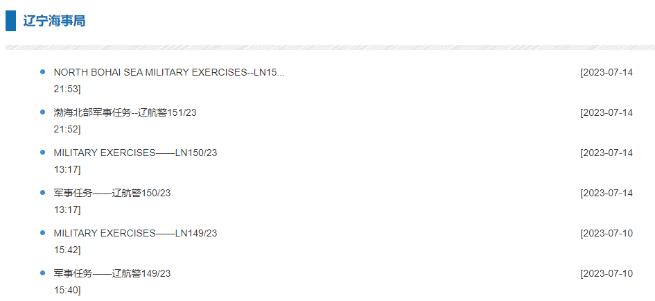 遼寧海事局密集發佈有軍事任務的航行警告 非軍事演習區域的航行警告,多為涉及航運安全的內容,諸如14號燈浮漂失、航道水深測量作業、警戒燈樁沉沒和航路交通管制等信息。