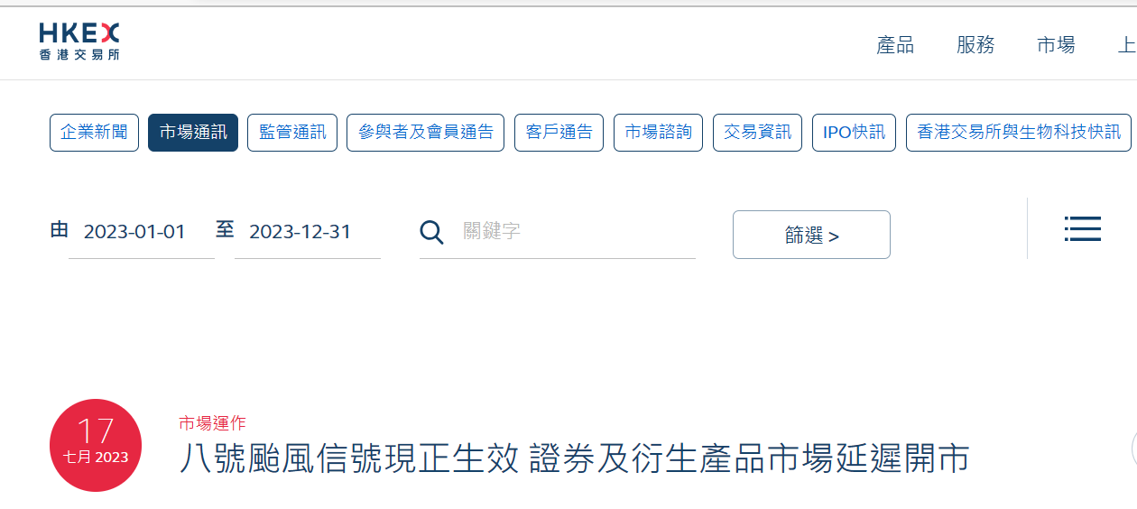 香港新聞網7月17日電 (記者 林霞)由於天文台現已發出八號烈風或暴風信號,港交所今早宣布,證券市場(包括滬深港通北向交易)及衍生產品市場今天(星期一)之上午交易時段會延遲開市。根據香港天文台今天凌晨零時40分發出八號風球,並至少維持至下午4時,那麼港交所下午會開市嗎? 據香港天文台消息,颱風“泰利”吹襲香港,天文台發出今年首個八號風球,並至少維持至下午4時。 香港新聞網記者今早在查看港交所今天上午發佈的最新消息顯示“八號颱風信號現正生效 證券及衍生產品市場延遲開市”的信息。既然香港天文台八號風球的消息將維持至下午4時,為何香港交易所發佈只是延遲開市時間呢?是否交易會有變化?