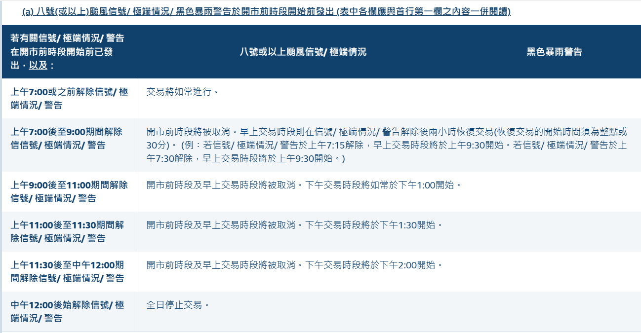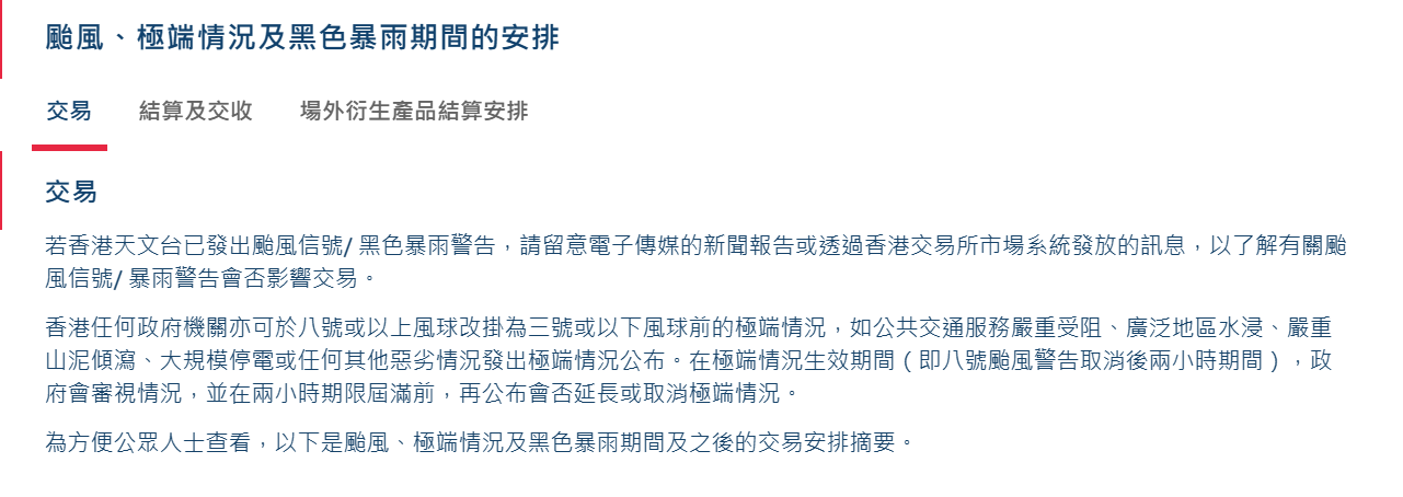 圖源:香港交易所 記者致電香港交易所電話尋求確認信息,對方一直處於繁忙狀態,未能接通電話。此後記者又致電匯豐金融服務有限公司,也無人接聽電話。 記者從香港交易所網上關於颱風、極端情況及黑色暴雨期間的安排的網頁,獲得如下的解釋: