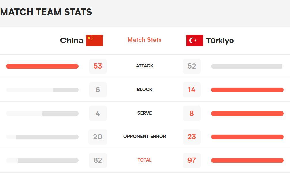 中國女排在比賽中 圖片來源:國際排聯 此前半決賽中,中國女排3:0戰勝了頭號種子波蘭隊,而土耳其隊3:1淘汰了東道主美國隊。 縱觀全場較量,土耳其隊一直掌控著比賽節奏,她們通過兩翼的進攻製造出大量威脅。而中國女排局面稍顯被動,最終遺憾落敗。四局比分為:22:25、25:22、19:25、16:25。 從賽後數據統計可以看出,攻防兩端,土耳其隊都是本場比賽中發揮更好的一方。兩隊失誤數幾乎持平的情況下,中國女排在發球與攔網兩個關鍵環節上的表現不如對手,這也是失利的重要原因所在。