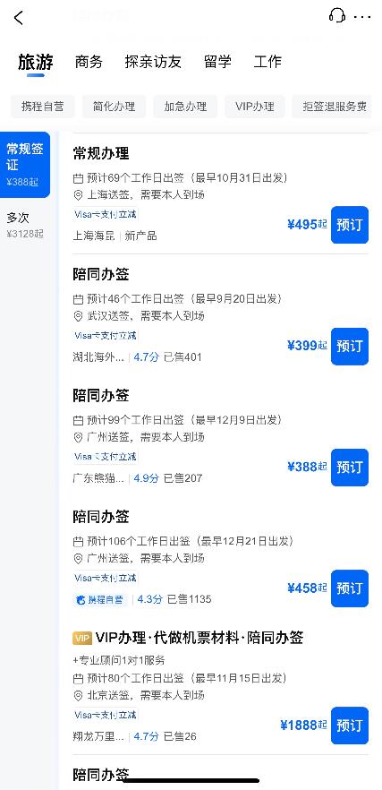 而在在線旅遊平台,以法國簽證為例,上海地區送簽常規辦理顯示最早10月31日出發。武漢送簽顯示最早9月20日出發。而廣州送簽則顯示最早出發時間在12月。