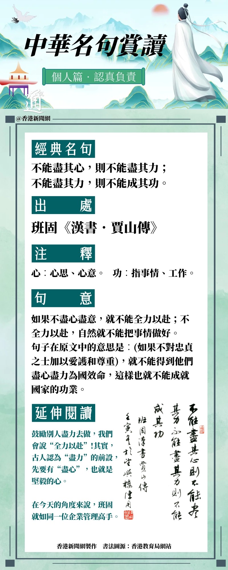 香港新聞網7月28日電 鼓勵別人要盡力去做,我們會說:“全力以赴”!其實,古人認為,“盡力”的前設,先要有“盡心”,也就是堅毅的心。 班固《漢書·賈山傳》就有這樣的名句:“不能盡其心,則不能盡其力;不能盡其力,則不能成其功。” 為加強中國文學和文言經典的學習,香港特區政府教育局繼續開展“中華經典名句推廣活動”,從《致知達德》(中華傳統美德語文學習資源)中選取40則名句,作為本學年推廣的內容。香港新聞網“中華名句賞讀”系列今日解讀名句“不能盡其心,則不能盡其力;不能盡其力,則不能成其功”。