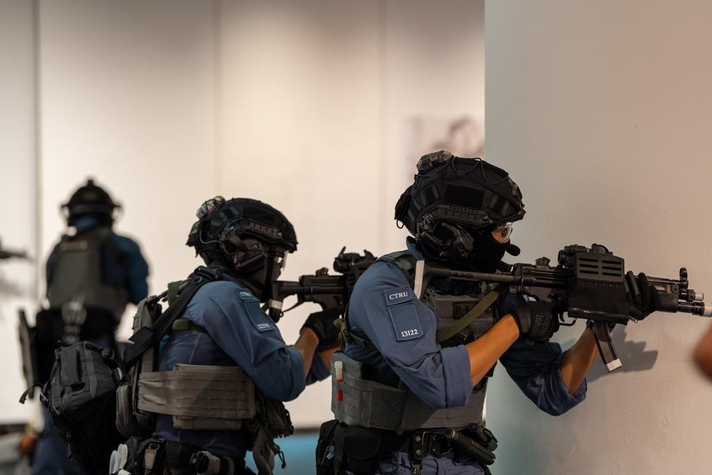 (圖源:政府新聞處) 此次演習有超過200名人員參加,包括港島總區的行動部、衝鋒隊、機動部隊、中區警區正規及輔警人員,以及反恐特勤隊,當中亦有學生積極參與此次演習。 演習亦邀請了新加坡志願特警(Volunteer Special Constabulary of Singapore Police Force)的部門首長、代表團成員,以及灣仔區撲滅罪行委員會主席及成員到場觀察並參觀新式的流動指揮站,讓他們更深入了解警隊的反恐工作和危機處理。
