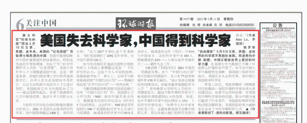 環球時報報道截圖 近年來,美國一直在對中國進行技術封鎖,尤其是拜登政府於2022年頒佈的《芯片與科學法案》,不但擴大了封鎖的範圍,還要求美國的盟友配合對華封鎖。不過美國一邊想要鎖死中國的高科技發展,一邊也將大量的學者“送回”了中國。 澳大利亞媒體報道稱,華盛頓的排華政策是在幫助中國招兵買馬。澳大利亞著名智庫卡托研究所報告 (完)指出,過去很長一段時間,相當一部分中國赴美深造的留學生都選擇留在美國工作,這導致中國出現了嚴重的人才外流。但最近幾年趨勢發生逆轉,如今中國的科研人才流入量已經超過了美國,其中有相當一部分科學家甚至放棄了在美國高校的終身教職,選擇回到中國進行科研活動。 (完) 【編輯:王軼南】