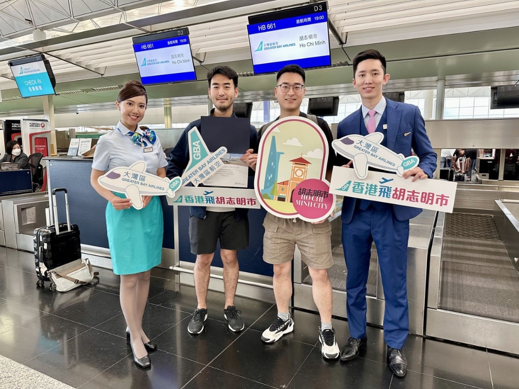 大灣區航空新推出的香港—胡志明市航線詳情。 出發前,大灣區航空職員於香港國際機場預辦登機手續櫃位,熱烈歡迎首航班機的乘客,並向他們致送紀念品及首航證書,以作留念。航班上,乘客更可享用由皇玥贊助的蝴蝶酥及脆曲奇。