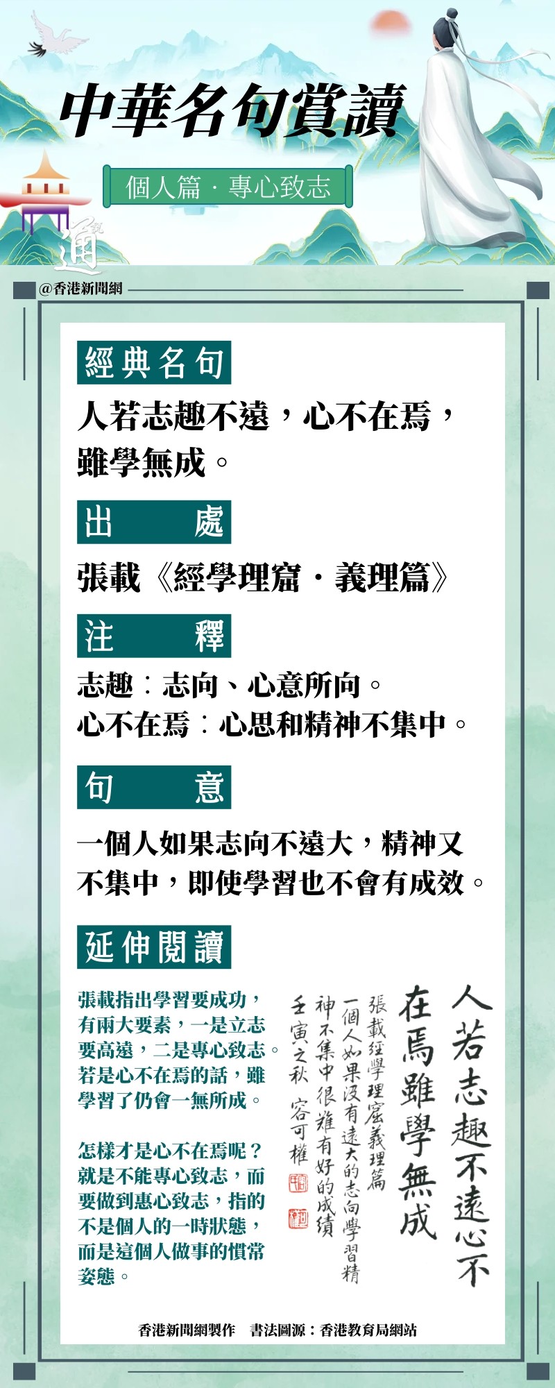 香港新聞網8月11日電 為加強中國文學和文言經典的學習,香港特區政府教育局繼續開展“中華經典名句推廣活動”,從《致知達德》(中華傳統美德語文學習資源)中選取40則名句,作為本學年推廣的內容。有見及此,香港新聞網推出“中華名句賞讀”系列,為讀者解讀這些名句。 我們經常勸勉年輕一輩說:“做人要有遠見,志向遠大一點。”在中華經典名句中,就有張載《經學理窟.義理篇》的“人若志趣不遠,心不在焉,雖學無成”,意思就是一個人如果志向不遠大,精神又不集中,即使學習也不會有成效。