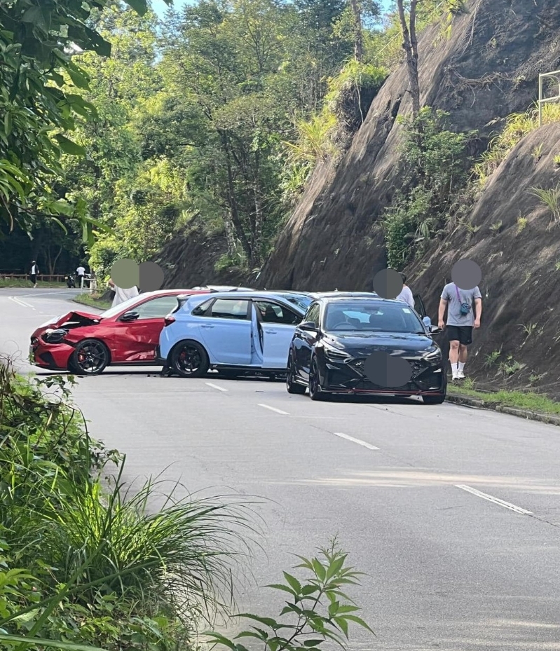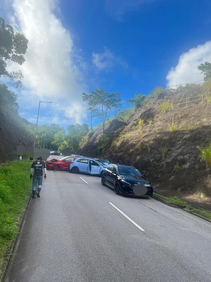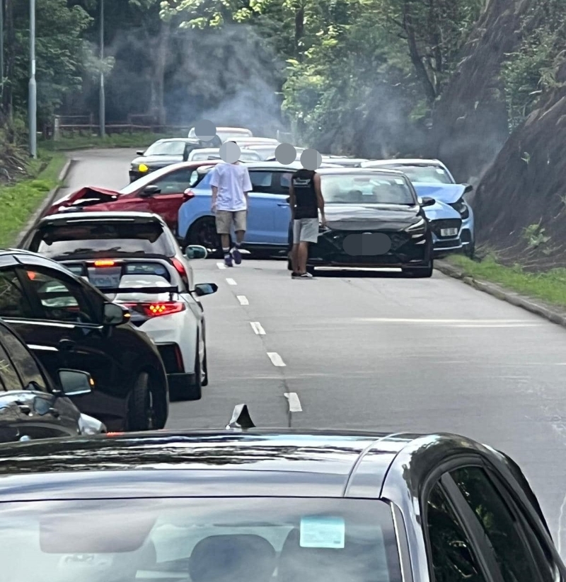 馬路的事 (即時交通資訊台)FB圖片。 事發在今日(23日)早上7時許,一輛私家車沿新娘潭路行駛,至降下拗附近時懷疑行錯線,導致9車連環相撞。有私家車被撞至車頭損毀,橫亙路中,冒出白煙。 事件造成至少6人受傷,當中包括5名私家車的司機。各人傷勢較輕,分別由救護車送院治理。警方封鎖現場調查。