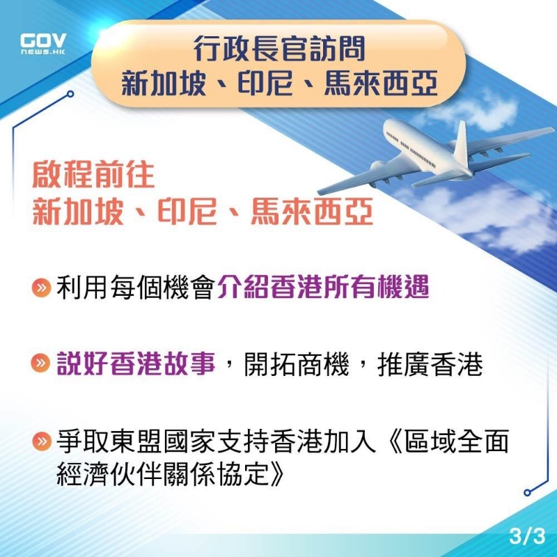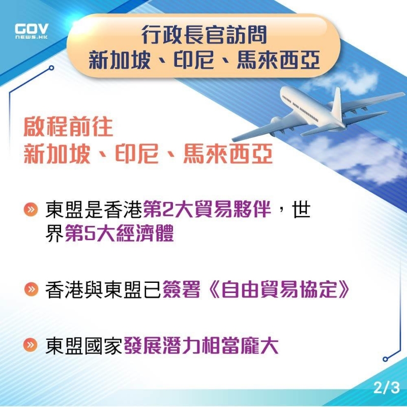 香港新聞網7月23日電 香港特區行政長官李家超今日(23日)率團前往3個東盟國家訪問,包括新加坡、印尼和馬來西亞。 李家超出發前在機場表示,東盟是香港第二大貿易夥伴和全球第五大經濟體,去年經濟增長5.5%,過去10年平均每年經濟增長4%,潛力龐大。加上現時全球經濟重點東移,亞洲和東盟有強勁發展動力,而香港和東盟已簽署自由貿易協定,有良好基礎加強合作。