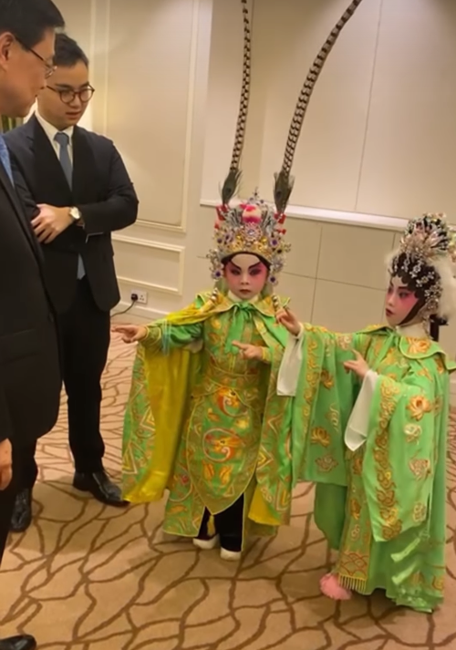 暐峻和思辰更現場清唱《鳳閣恩仇未了情》。李家超FB圖片 根據李家超上傳的影片可見,暐峻和思辰更現場清唱《鳳閣恩仇未了情》,期間李家超亦大開金口唱了一句“休涕淚”鼓勵小演員。可見兩位小演員雖略有緊張,但雙運指及唱腔都絕不馬虎。 李家超說,粵劇是中華文化的瑰寶之一,擁有悠久的歷史和深厚的文化底蘊。國家《十四五規劃綱要》明確支持香港發展成為中外文化藝術交流中心,當晚劇團的演出,正好能夠向海外國家展示香港文化藝術交流的獨特優勢。