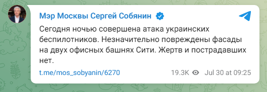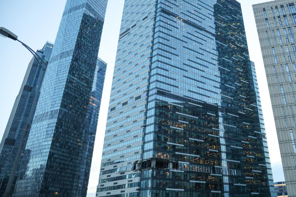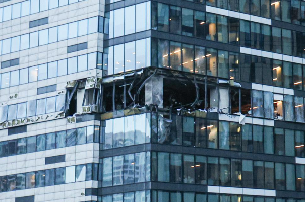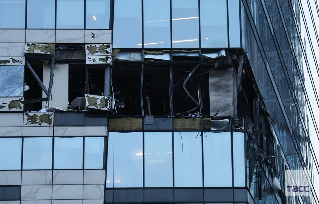 其中一座受損大廈的照片,塔斯社報道截圖 據俄羅斯塔斯社30日最新消息,莫斯科市長索比亞寧30日晚在Telegram上稱:烏克蘭無人機凌晨發動襲擊,莫斯科市的莫斯科國際商務中心2座辦公大廈外立面輕微受損,無人傷亡。