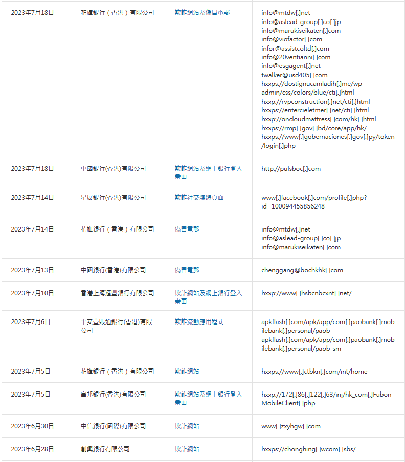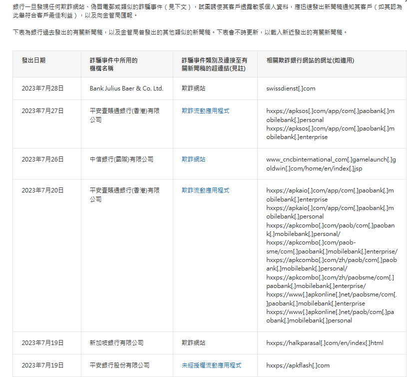 香港新聞網7月31日電 香港金融管理局(金管局)公佈信息,呼籲市民提高警覺,留意一個由Bank Julius Baer & Co. Ltd.所發出關於欺詐網站,有關銀行已向金管局匯報事件。 金管局提醒公眾,銀行不會透過短訊或電郵超連結,引領他們到其網站進行交易,更不會以電話、電郵及手機短訊(包括以超連結方式),要求客戶提供任何敏感的個人資料(包括登入密碼和一次性密碼)。 任何人士若曾向該網站提供其個人資料,或曾透過該網站進行任何交易,應利用有關新聞稿中的聯絡資料聯絡有關銀行,及聯絡香港警務處刑事總部資訊中心(電話號碼:2860 5012)。以下為金管局接報有關銀行的欺詐網站。