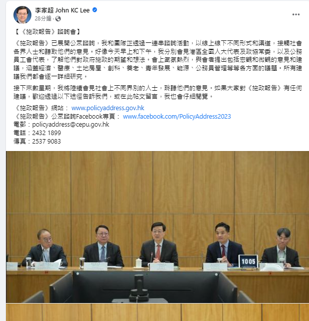 李家超指會以不同渠道聽取各界意見。李家超FB圖片 他續指,接下來數星期將陸續會見社會上不同界別的人士,聆聽他們的意見。李家超在文中又附上相關公眾諮詢電話、電郵及網頁,以便市民提供建議。(完)