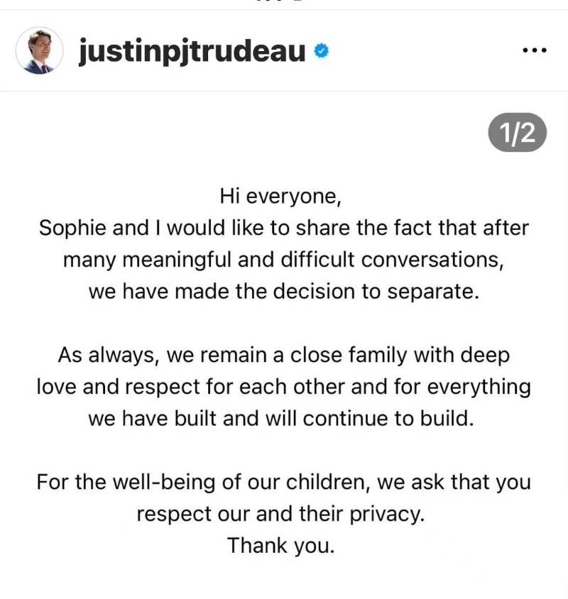 杜魯多Instagram截圖。 特魯多的妻子蘇菲也在社媒上發表幾乎雷同的貼文。特魯多的辦公室也發表聲明指出,特魯多夫婦已簽署“分居法律協議”,公眾可以期待繼續看到他們與子女在一起,因為“他們仍是親密家人”,兩位家長都會“持續出現在他們孩子的生活中”。 中通社記者翻查特魯多和蘇菲的社交媒體歷史貼文發現,雙方的照片最後一次出現在對方的社交媒體賬號上,分別是是6月18日父親節和5月14日母親節。
