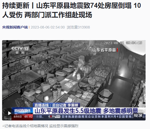 圖為地震發生時的監控畫面截圖:當地一家超市內物品散落一地,人員正在往外逃離。圖自網絡 8月6日2時33分:山東德州市平原縣發生5.5級地震 震源深度10千米 中國地震台網正式測定:08月06日02時33分在山東德州市平原縣(北緯37.16度,東經116.34度)發生5.5級地震,震源深度10千米。 8月6日3時09分:山東德州市平原縣發生3.0級地震 震源深度9千米