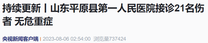 8月6日6時30分:平原縣第一人民醫院接診傷者,無危重症 央視記者趕到了山東平原縣第一人民醫院,截至今早6時30分,該院共接診21名與地震相關傷者,多數為皮外傷、擦傷、頭部外傷等,目前無危重症患者。
