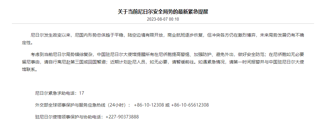 香港新聞網8月7日電 中國駐尼日爾大使館網站8月7日就當前尼日爾安全局勢緊急提醒在尼僑胞做好安全防範。這是中國駐尼日爾使館十天內第二次就尼日爾安全局勢發佈緊急提醒。 z 中國駐尼日爾大使館緊急提醒。圖源:中國尼日爾大使館 使館指出,尼日爾發生政變以來,尼國內形勢總體趨於平穩,陸空邊境有限開放,商業航班逐步恢複,但衝突各方仍在激烈博弈,未來局勢發展仍有不確定性。 考慮到當前尼日爾局勢錯綜複雜,中國駐尼日爾大使館提醒所有在尼僑胞提高警惕、加強防護、避免外出,做好安全防範;在尼僑胞如無必要留尼事由,請自行離尼赴第三國或回國暫避;近期計劃赴尼人員,如無必要,請暫緩前往。如遇緊急情況,請第一時間報警并與中國駐尼日爾大使館聯繫。 尼日爾緊急求助電話:17 外交部全球領事保護與服務應急熱線(24小時): +86-10-12308 或 +86-10-65612308 駐尼日爾使館領事保護與協助電話:+227-90373888