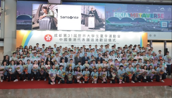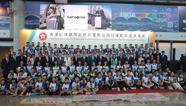 香港中通社8月8日電(記者崔靜雯)由警隊為主組成的香港特區紀律部隊代表團,7月28日至8月6日參加在加拿大舉行的第20屆世界警察和消防員運動會,合共取得275面獎牌。8日下午,部分團員凱旋,在國際機場受到香港市民熱烈歡迎。 當天,特區政府在香港國際機場舉行儀式,迎接代表團凱旋。政務司司長陳國基、保安局局長鄧炳強、保安局常任秘書長李百全、警務處處長蕭澤頤和海關關長何珮珊出席。 不少警員的孩子早早在機場等候。代表團成員一一步出接機大堂,孩子開心向他們招手。