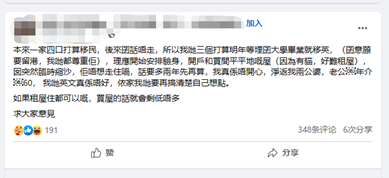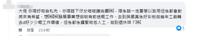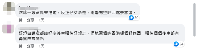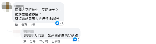港媽發帖求助。臉書截圖 考慮到失去子女支持,自己和丈夫在異國他鄉恐生存艱難,該港媽不免糾結,稱丈夫已經60歲上下,而且兩人的英文“真是不好”。 至於居住問題,該港媽表示,若在英國租房住就沒問題,但因為自家有養貓,很難租到合適的房子,或考慮買一間“平平的(很一般的)”房。但那樣,就沒有多少錢剩下了。 無計可施下,該港媽於網絡發帖“訴苦”,請網友給出意見。 帖文一經發出,很快引起眾多網友討論。在帖文評論區,有網友表示,自己認識的很多年輕人都不想移居國外,畢竟“他們已經習慣了香港這個舒適圈,不是所有年輕人都有從零開始的勇氣。”認為該港媽的子女“說過兩年再走,其實就是不想走”。 不少港人談及移民原因時,均會拿“為了下一代”當藉口。但現在看來,不過是一些家長一廂情願的想法。有網友就一針見血地指出,該港媽的移英計劃,並未考慮子女的就業前途,十分“自私”。認為年輕人剛畢業時總希望做些有前途的工作,若此時去了英國,很可能是先在工廠工作幾年,然後換一份工作環境稍微好點、但薪酬依舊很低的工作一直做到退休。若是如此,談何發展事業?