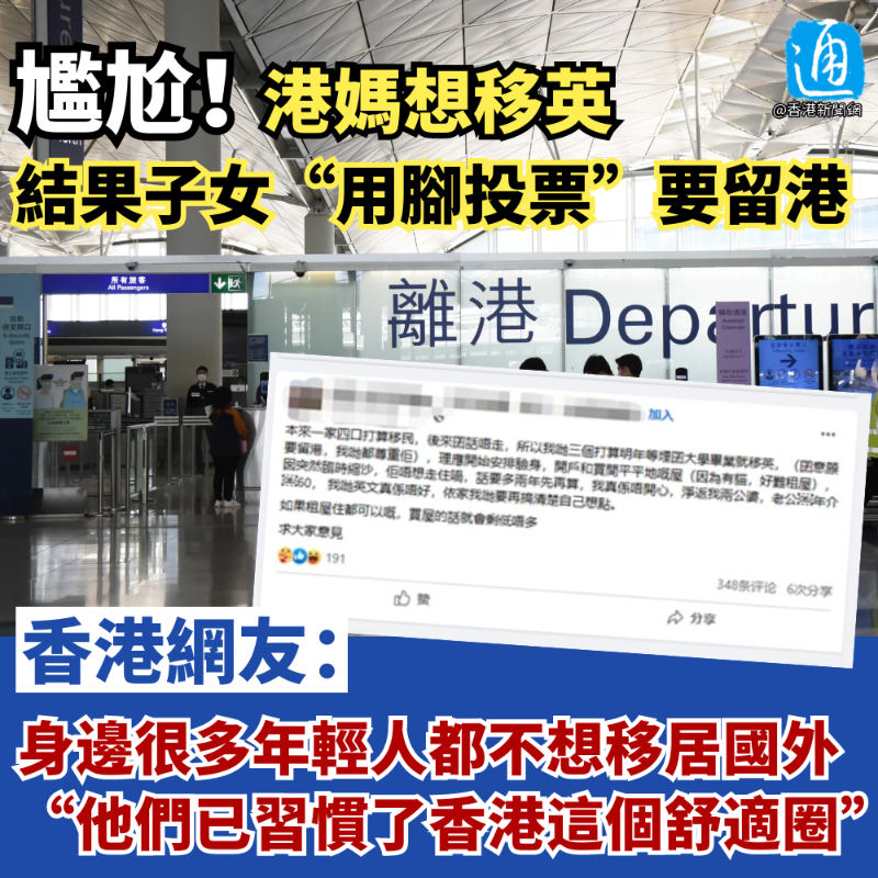 香港新聞網8月9日電 港媽想移英,結果子女“用腳投票”,選擇留港…… 日前,一位港媽在社交平台臉書的討論區發帖,向網友尋求意見。該港媽表示,他們一家四口本來計劃移居英國,後來兒子說不走了,自己和丈夫都尊重他的留港意願,於是計劃等明年兒子大學畢業後只帶女兒移英。