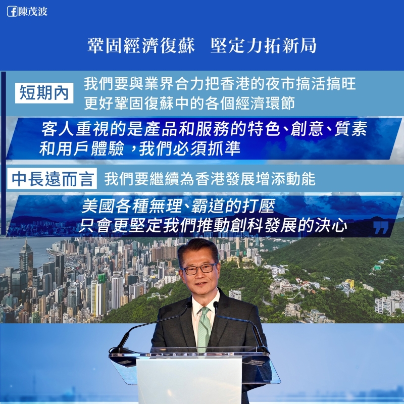 他說,而香港零售和餐飲業的表現在第二季也正在改善。零售總銷貨價值和食肆總收益按年分別上升17.6%及24.3%,分別回復到2018年同期逾八成半和九成半。上述數字反映,第二季港人增加在境外消費的同時,在港的消費亦有增長。而踏入下半年,香港旅遊業的復蘇也有加快的趨勢。7月訪港旅客人數約360萬人次,即每日約有11.6萬旅客訪港,按月上升超過3成。其中,內地和東南亞市場恢復較快;內地遊客數量已恢復至約疫情前7成;而東南亞國家如菲律賓的遊客已超過疫情前;泰國遊客則超過9成,8月首10天的日均訪港旅客數量更超過13萬。 陳茂波指,雖然訪港旅客數字正在快速恢復,但香港仍要不斷提升自身的競爭力和吸引力。根據旅發局的調查顯示,內地旅客的消費習慣有所改變,以購物作為主要來港目的的比例,較疫情前有所下降。然而,新的模式、新的轉變也帶來新的機遇。不少旅客,特別是年輕遊客群體,他們來港旅遊的目的更多為參與文化、藝術和展覽活動,或者觀賞大型演唱會等。就以早前的香港動漫電玩節為例,不少內地和東南亞遊客是專程來港參與,更有參展商指參觀者願意購買具創意、特色的產品。他認為現時需更著重客人重視的產品和服務的特色、創意、質素和用戶體驗。 陳茂波表示,要抓緊機會,推動香港旅遊業朝多元、高增值、可持續的方向發展。短期內要與業界合力把香港的夜市搞活搞旺,更好鞏固復蘇中的各個經濟環節,保持復蘇動力;而中長遠而言,要繼續為香港發展增添動能。本屆政府推動創科發展決心堅定,要把創科發展成為推動本港經濟高質量發展的重要引擎之一。