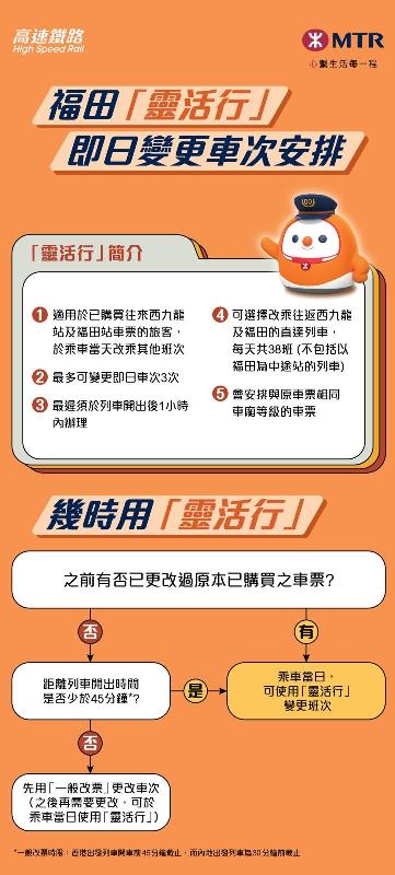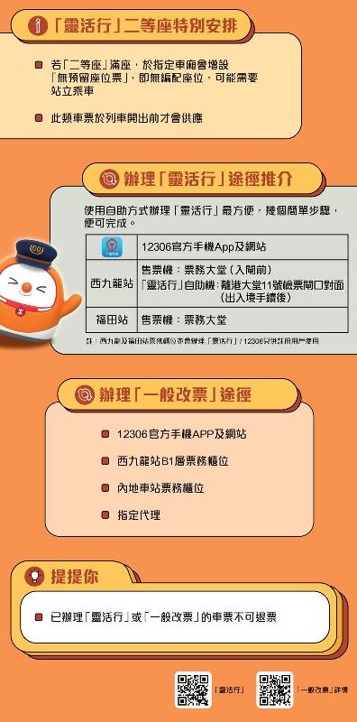 港鐵13日表示,會設立諮詢櫃位及加派人手,協助乘客熟悉新安排。 靈活行適用範圍: .已購買往來西九龍站及福田站旅客、於乘車當天改乘其他班次 .可選擇改乘往返西九龍站及福田站的直達列車,每天共38班 靈活行可改票時間及次數: .最遲於原來車次開車後1小時內辦理 .最多可變更即日車次3次 “一般改票”截止時間及途徑: .如之前未曾更改過已購買的車票,乘車當又未過“一般改票”截止時間,首先要使用“一般改票”更改行程 .“一般改票”時限,香港出發列車於開車前45分鐘截止,內地出發列車為30分鐘前截止 .“一般改票”途徑,12306官方手機App及網站、西九龍站B1層票務櫃位、指定代理、指定代理 靈活行辦理途徑: .12306官方手機App及網站 .西九龍站票務大堂(入閘前) .西九龍站靈活行自助機(離境大堂11號驗票閘口對面)(出入境手續後) .福田站票務大堂售票機 靈活行限制: .持二等座車票旅客辦理靈活行時,有機會被安排“無預留座位票”,可能需站立乘車 .不包括以福田為中途站車次 .不可改變車票種類、席位等級 .不可退票 【編輯:紀東】