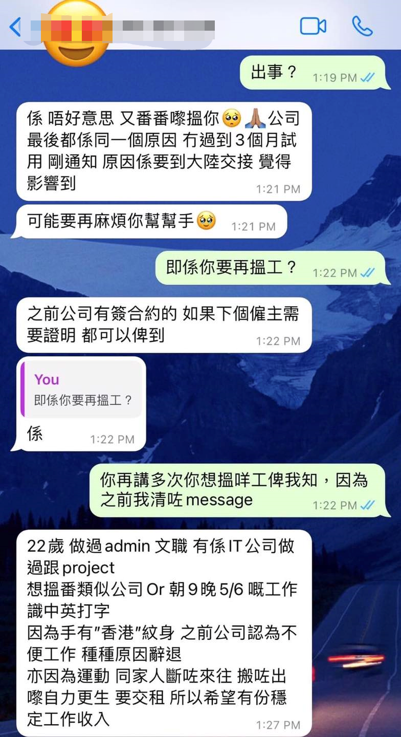 “初見First Sight_HK”臉書截圖 至於該“手足”求職難的原因,帖文亦提到,該“手足”曾因手上有涉及“港獨”口號的紋身而被公司辭退。 從帖文曬出的聊天記錄截圖中可見,該“手足”坦言,多間公司都是因為這一原因未讓自己通過三個月的試用期,因為工作有機會去內地交接,認為其紋身會造成不良影響。