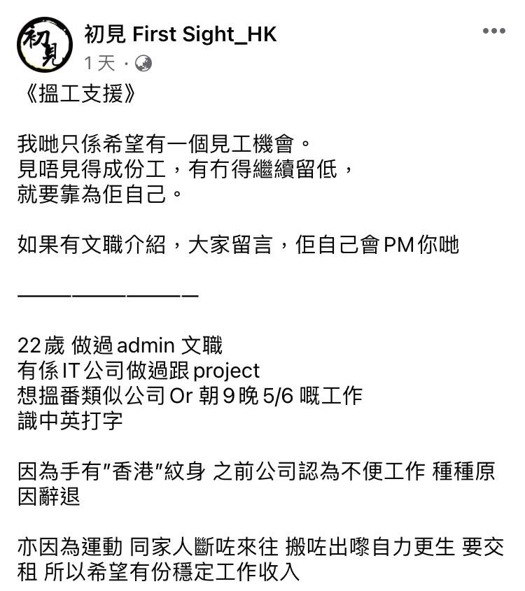 (香港新聞網製圖) 日前,“黃店”“初見First Sight_HK”在其臉書專頁發布一則“手足”投稿的求助帖,表示希望其他“同路人”支援其找工作。 帖文稱,該“手足”只是希望能有一個面試機會,至於能否順利入職、留下來工作就要靠他自己了。希望有文職工作介紹的網友將相關信息留在評論區,該“手足”會自行聯繫。 該帖文介紹了投稿“手足”的大概情況,稱其今年22歲,會使用中文和英文打字,曾做過行政類文職,亦在信息科技公司跟進過一些項目,現在想找一份類似公司的工作,或者能夠上午九點上班、下午五點或六點下班的工作。