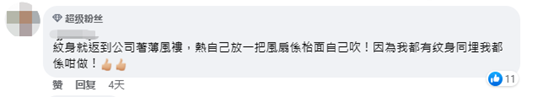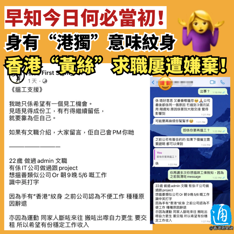 聊天記錄截圖 該“手足”最後不忘“賣慘”,稱自己因在“修例風波”期間參加非法示威活動,與家人斷了來往。如今搬出來“自力更生”,不得不背負房租壓力,“所以希望有份穩定的工作收入”。 然而,在此帖文下方評論區,未見幾條有價值的崗位信息,卻有不少“手足”建議事主在遮擋紋身方面下功夫。有人建議其穿著薄風衣去公司上班,熱的話也不要脫,而是自己買一台風扇來吹。