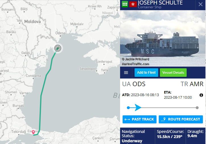 船舶信息網站Marine Traffic上關於該貨輪的預測航線。圖源:觀察者網 另據船舶信息網站Marine Traffic顯示,“JOSEPH SCHULTE”號於北京時間16日13時13分出發,預計於北京時間17日15時抵達目的地。截至目前,“JOSEPH SCHULTE”號仍保持正常航行狀態。俄羅斯方面尚未對該貨輪出港作出回應。 8月10日,烏克蘭軍方宣布為進出烏克蘭港口的商船設立臨時走廊,並開始對準備通過黑海臨時走廊前往烏克蘭港口的商船進行登記。下一步烏克蘭將重點保障通過黑海的船舶、船員和農產品出口安全。烏克蘭今年的國家預算為準備從烏克蘭港口出口農產品的船隻提供200億格里夫納(約合5.4億美元)的保險。 7月17日俄羅斯宣布終止黑海港口農產品外運協議,俄國防部7月19日宣布海上人道主義走廊關閉,從7月20日起,所有在黑海水域航行至烏克蘭港口的船隻都將被視為潛在的“軍用貨物承運人”,此類船隻懸掛船旗所代表的國家將被視為參與衝突并支持烏克蘭。此舉一度引發美歐方面強烈反彈。認為,俄羅斯此舉等同於在黑海實施“封鎖”, 8月10日,烏克蘭宣布在黑海建立一條“人道主義走廊”臨時航線,允許滯留在烏克蘭港口的貨運船隻離開。 8月13日,俄羅斯海軍一艘巡邏艦在黑海西南部水域對一艘懸掛帕勞國旗的貨船開火示警,當時這艘貨船正駛向烏克蘭。這是黑海糧食協議終止以來,俄羅斯首次對烏克蘭以外的商船采取此類行動。(完) 【編輯:王軼南】