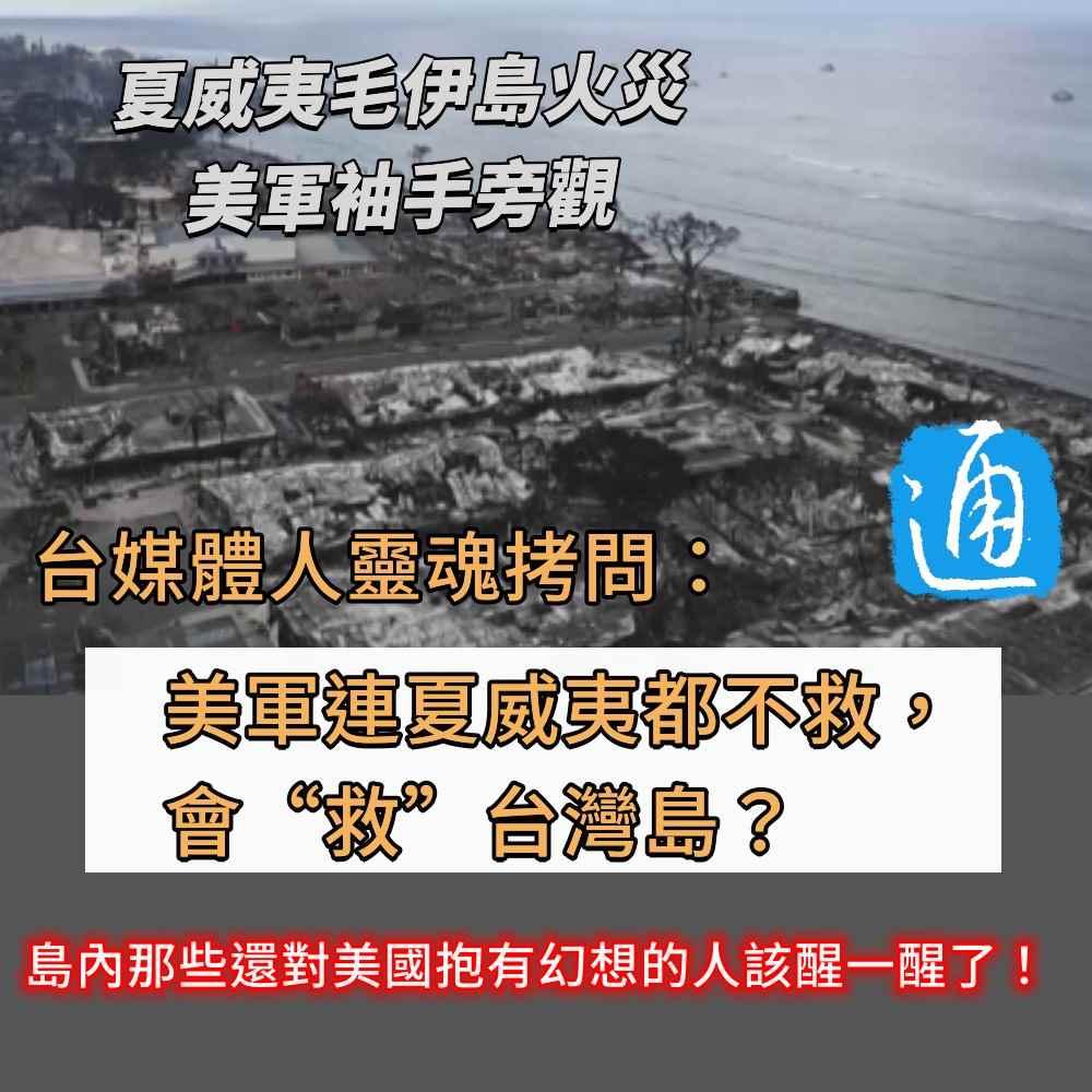 香港新聞網8月18日電 美國夏威夷毛伊島(Maui)日前發生致命火災,昔日度假勝地瞬間變成人間煉獄。然而,面對這場災難,美國總統拜登仍是“度假優先”,駐紥在當地的美軍更被曝“隔岸觀火”,直到大火基本燒完才出現,各種救援也是遲遲不到位。對此,台灣資深媒體人蔣德綱發出了一個靈魂拷問:美國連夏威夷孤島都不願救,還會“救”台灣?