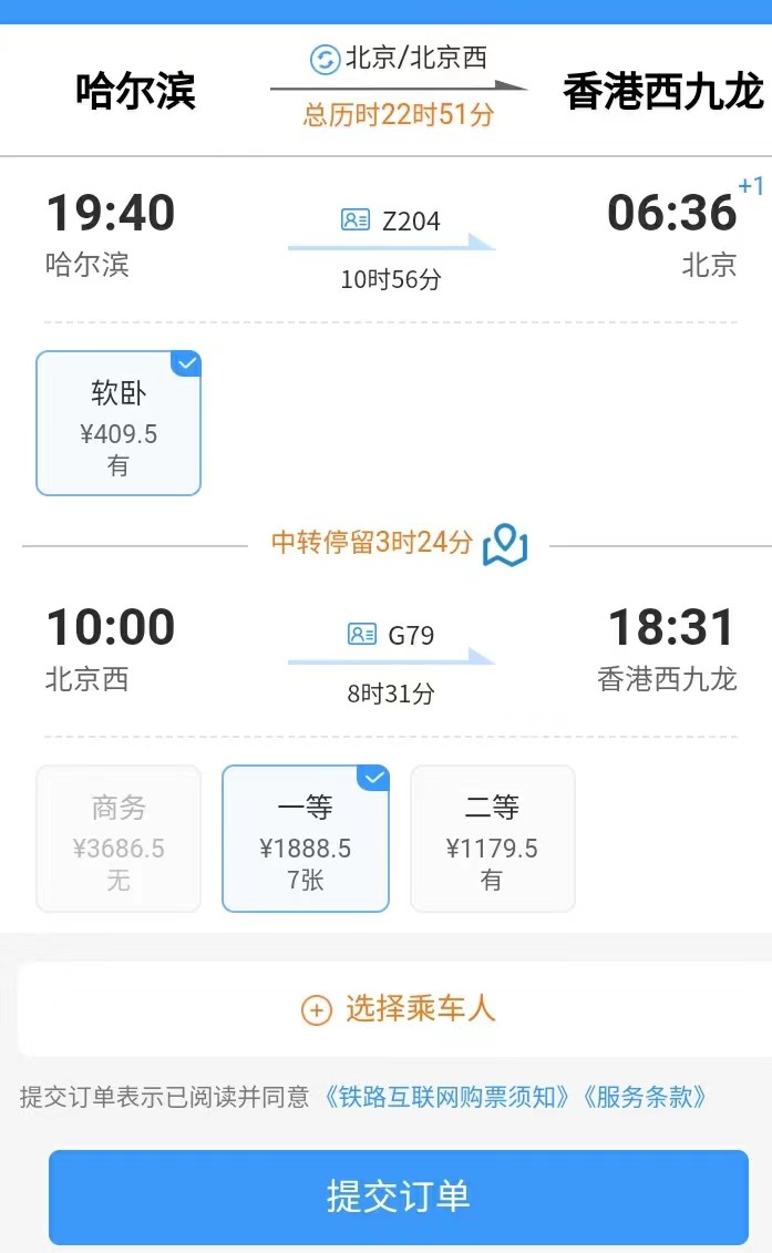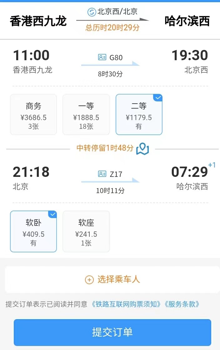 去程線路:近午時分,坐上從香港西九龍的高鐵,一路狂奔,晚上到了北京高鐵站轉車,接下來就安心地在軟臥上睡一覺,第二天上午7點半就到了哈爾濱,馬上可以開始你的旅程了。