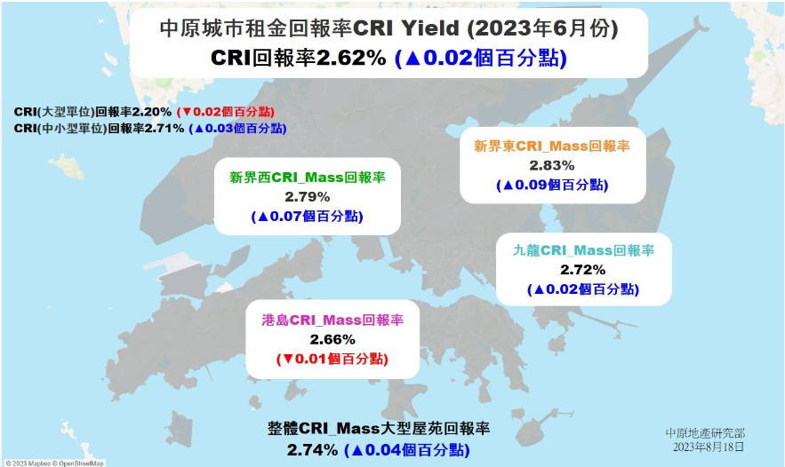 香港新聞網8月19日電 與租賃市場的火熱相比,香港樓市二手交投依然是下跌行情。中原地產昨(18日)晚發佈最新的中原城市領先指數CCL和CRI,數據顯示,租金CRI回報率創6個月新高,但二手楼价CCL卻跌穿163點,創26周新低,重返今年2月水平。 數據顯示,CRI最新報165.42點,按周升0.42%,連升三周并重上165點水平。2023年6月H按息為3.5%,同期租金回報率低H按息0.88厘。CRI回報率繼續從後追趕H按息的升勢。自2022年9月起,H按息已經連續10個月高於回報率。