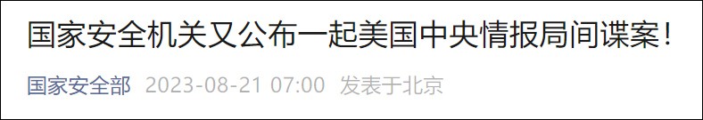 香港新聞網8月21日電 據中國“國家安全部”微信公眾號今日(21日)最新消息:近日,中國國家安全機關又破獲一起美國中央情報局間諜案。