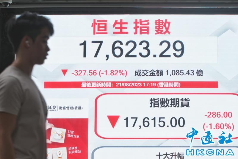 香港中通社8月21日電(記者 張明臻)反映中概股表現的金龍中國指數上個交易日急跌3.5%,加上內地降貸款市場報價利率(LPR)幅度未符預期。恒生指數8月21日收報17623點,跌327點或1.8%;大市全日成交1085億港元。