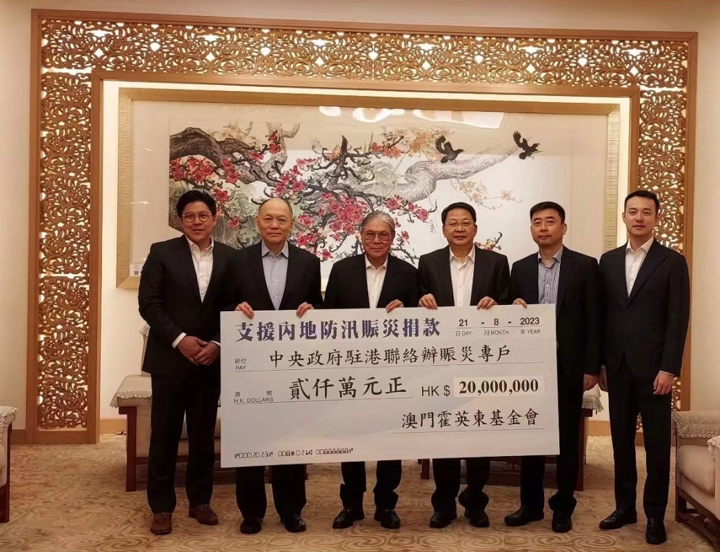 香港新聞網8月21日電 近期,受颱風“杜蘇芮”影響,京津冀地區暴雨洪澇災害嚴重。澳門霍英東基金會高度關注內地災情,為支援救災搶險和災後重建工作,8月21日上午,澳門霍英東基金會代表霍震霆、霍震寰、霍啟剛、霍啟文等到中聯辦捐款2000萬港元,由尹宗華副主任、朱文部長代表接收,捐款將經香港中聯辦轉至受災地區,幫助受災同胞戰勝困難。