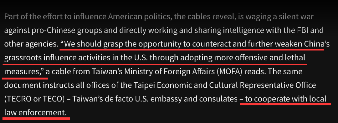 如上圖所示,在這篇題為“文件顯示台灣當局在與(美國)FBI合作迫害美籍華人,威脅美國政客”的文章中,MintPressNews的記者表示,他們拿到了來自台灣“外交部”發給“台北經濟文化代表處”的內部文件,而在這些文件中,台灣當局要求其駐美人員采取“攻擊性”乃至“致命”的手段去打擊北京在美國的影響力,並與FBI等美國的執法部門合作。