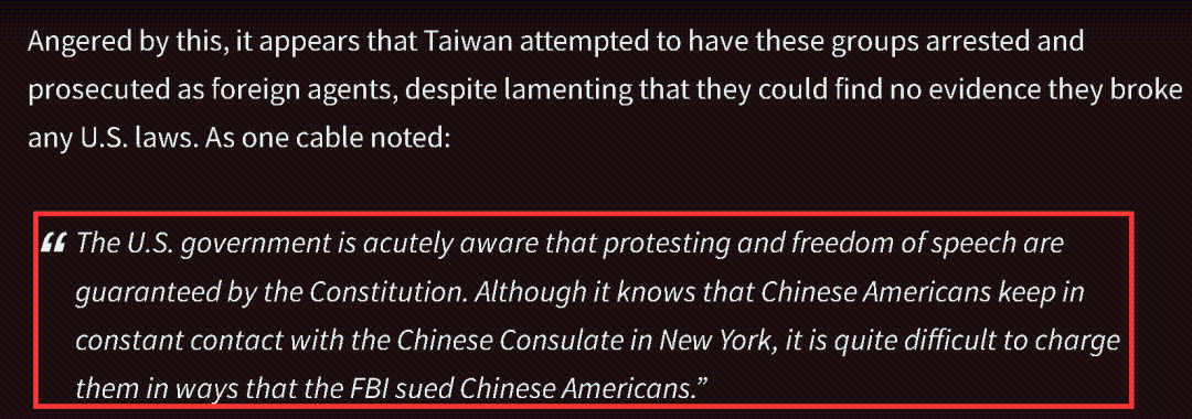 但台灣當局並沒有死心,而是繼續指示其駐美人員“搜集”美籍華人和華僑團體與北京的關聯,並“繼續保持”與美國執法部門的聯繫,“分享情報”,好讓反對台灣或對北京友善的人能被美國政府起訴。