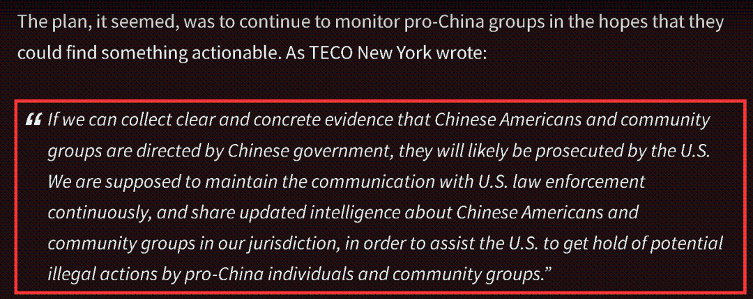 台當局還在這些文件中將親大陸的美籍華人和華僑團體說成是北京影響美國政治的“渠道”和對台灣的“重大威脅”,要求其駐美人員緊盯北京在美國的行動,對這些團體進行滲透,並時常與美國的官員“分享情報”。 “我們高興地看到一些在當地的官員已經與美國聯邦人員進行情報交換了”,台當局的文件中寫道。