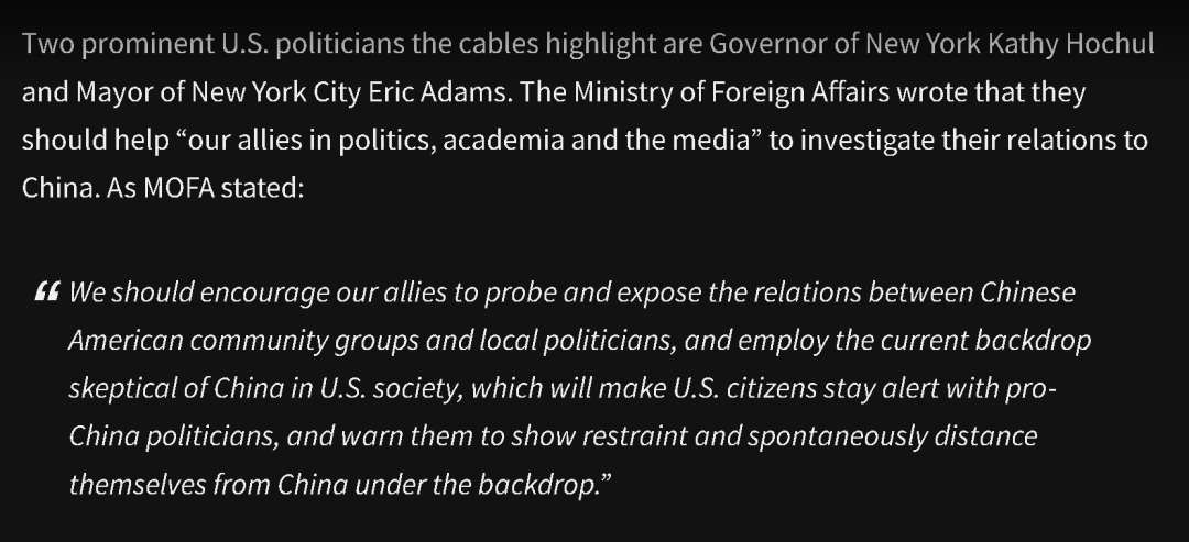 不過,與美國FBI合作迫害對華友善的人,只是台灣當局這份惡毒計劃的一部分。 因為MintPress News獲得的文件顯示,台當局還盤算著通過煽動美國民間反華情緒,並利用美國的政客、學者和媒體去迫害那些並不敵視北京,甚至希望與北京搞好關係的美國政客。 台灣當局的文件還特別提到了美國紐約州的女州長凱茜·霍楚爾(KathyHochul)和紐約市長埃里克·亞當斯(Eric Adams)。 台當局要求其駐美人員通過其在美國“政壇、學術圈和媒體的盟友”去調查像他們這樣的“友華”政客,迫使他們與北京“劃清界限”。