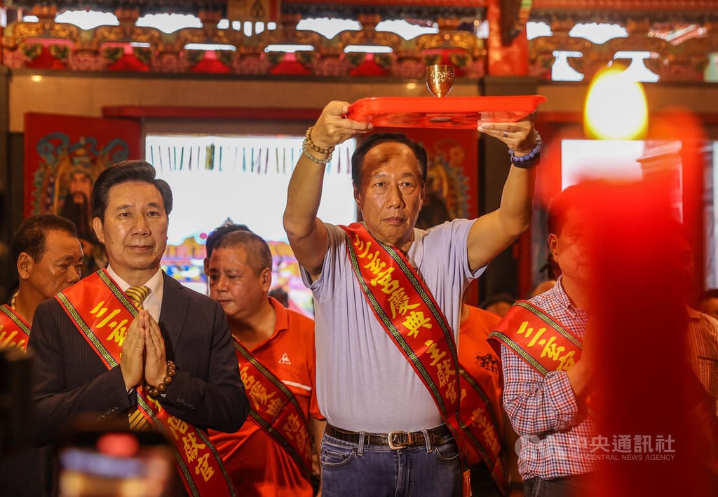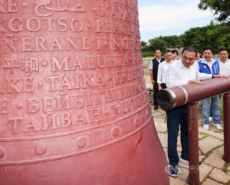 侯友宜(前)22日前往金門和平紀念園區,敲響和平鐘。圖源:台灣“中央社” 郭台銘參加完“主流民意大聯盟”活動後,下午到烈嶼三玄宮參拜。郭台銘在致詞時表示,從5月13日至今,他已經到金門3次,就是祈求兩岸和平、不要戰爭。他祈求所有神明保佑,因為戰爭只會讓兩岸人民疏遠,絕對不會帶來任何一方的勝利。