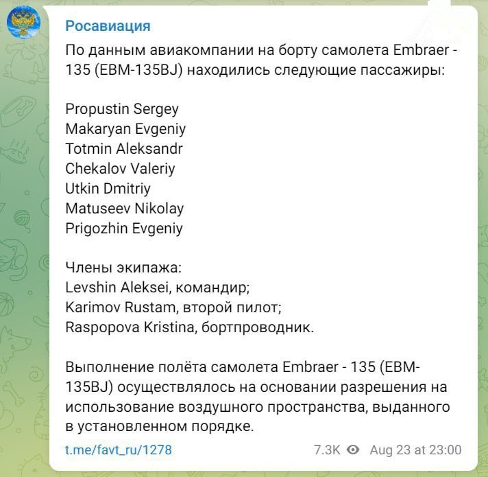 香港新聞網8月24日電 當地時間23日,俄羅斯特維爾州政府新聞部門發佈消息稱,當天(23日),一架民用飛機在該州博洛格耶市庫仁基諾村附近墜毀。目前,執法機構和緊急情況部門人員正在現場開展工作。隨後,俄羅斯聯邦航空運輸署發佈了特維爾州失事飛機人員名單,并確認俄羅斯私營軍事承包商瓦格納集團創始人普里戈任,以及瓦格納創始人之一、指揮官烏特金在失事飛機上。