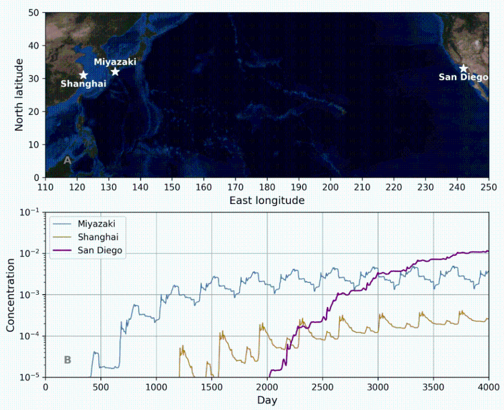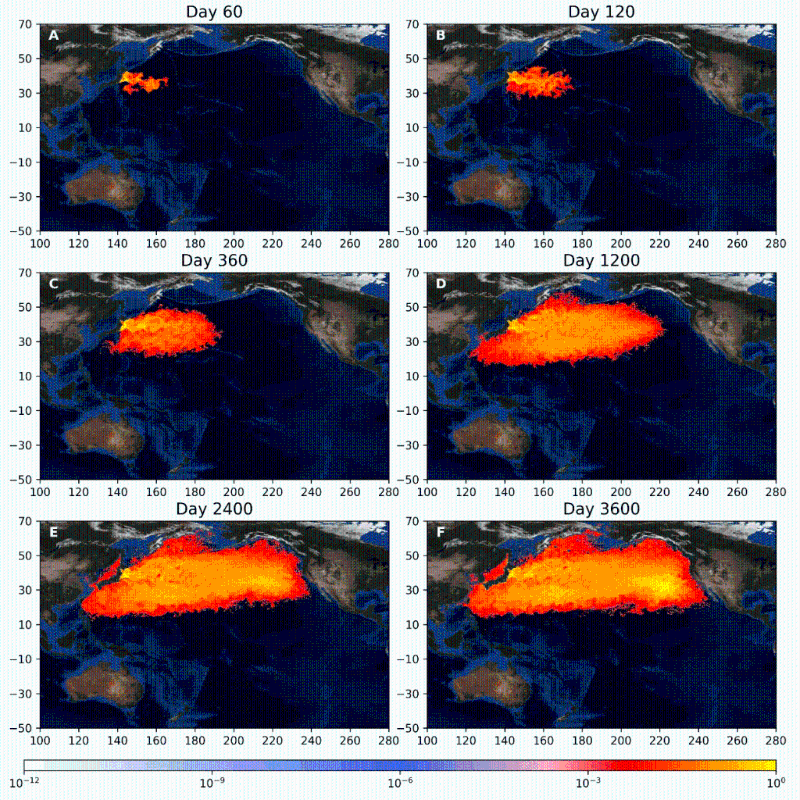 氚的微觀擴散模擬結果 好一個“以子之矛攻子之盾”。 汪文斌還表示,日方迄未解決國際社會關於核污染水淨化裝置的長期可靠性、核污染水數據的真實準確性、排海監測安排的有效性等重大關切。日方強推核污染水排海,不正當、不合理、不必要,是極其自私、極端不負責任的行為。 第三個原因是,太平洋彼岸的美國似乎沒怎麼反對日本核污水排放。是因為日本的核污水流不到美國嗎? 事實上,無人能幸免。國際多個研究團隊通過專業宏觀模擬發現,福島的核污水自排放後240天,就會流達到中國沿海海域。約1200天后,這份污染物將到達北美沿岸并覆蓋幾乎整個北太平洋。 隨著赤道洋流的影響,污染物會沿著美洲海岸向南太平洋擴散,同時也將通過澳大利亞北部海域向印度洋轉移。儘管福島附近是污染物的原始排放區,但隨著時間的推移,高濃度污染物區域將延伸至35°N線附近,從東亞海域擴散至北美海域。 最為重要的一點,研究團隊的模擬結果顯示,在接近第2400天時,中國東南沿岸海域的污染程度相對較低,呈現淺粉色。相反,北美西側海域已經基本被高濃度的紅色污染物覆蓋。