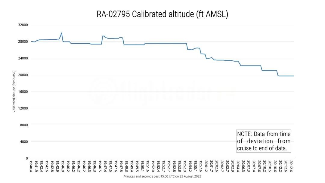 圖為墜機現場。圖自央視新聞 據悉,目前飛機墜毀的具體原因尚不清楚,俄羅斯已成立專門的委員會調查此事。但航班數據追蹤網站Flightradar24在23日晚些時候透露,失事飛機在最後30秒曾經歷一次“急劇下降”。 據路透社報道,可能是由於干擾等原因,這架飛行在當地時間23日18時11分停止傳輸位置信息。但飛機在之後的9分鐘裡持續傳輸飛行高度、速度、垂直速度等其他數據,使得Flightradar網站瞭解到飛機墜毀前的情況。 相關數據顯示,飛機在28000英尺(8534.4米)的高度平穩飛行,并進行了一些輕微的高度變化。但從18時19分開始,飛機的高度驟然下降,在數據傳輸停止前的大約30秒內下降了8000英尺(2438.4米)。