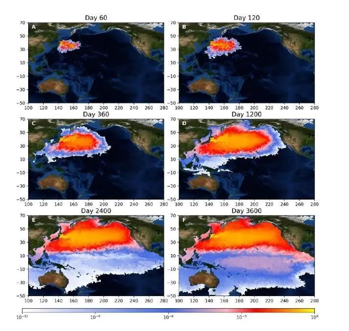 氚的宏觀擴散模擬結果 央視此前製作的圖示亦顯示,福島核污水排放後,會在57天內污染太平洋大半區域,並在10年後蔓延全球海域,對人類和地球生物造成重大影響。韓媒也指出,被污染的海水只需220天就會抵達濟州島,400天后就會到達韓國西海岸。一家來自德國的海洋科學研究機構的計算結果顯示,3年後美國和加拿大就將遭到核污染影響。(完) 【編輯:劉春】