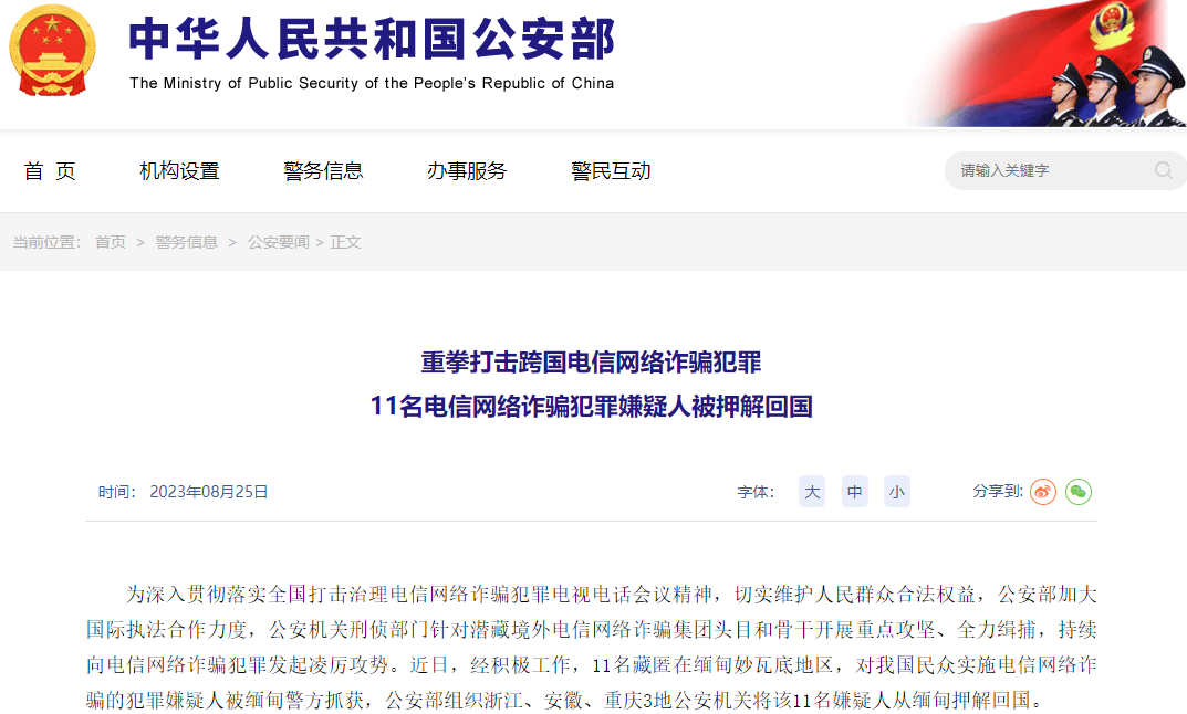 截圖自中國公安部網站 中國公安部介紹,近年來,隨著中國對電信網絡詐騙犯罪打擊力度的持續加大,不法分子將詐騙窩點轉移藏匿在緬甸、柬埔寨、菲律賓等國家,特別是“金三角”、緬北地區“詐騙”園區內,大肆對中國內地民眾實施虛假投資理財、刷單、網絡貸款等詐騙,並衍生出非法拘禁、綁架、人口販運等各類違法犯罪,危害十分嚴重。 中國公安部去年6月以來,會同最高法、最高檢等有關部門聯合部署開展“拔釘”行動,嚴厲打擊懲處電信網絡詐騙集團重大頭目和骨干。今年以來,又陸續派出工作組赴菲律賓、柬埔寨、緬甸、老撾等多個國家開展國際執法合作,嚴厲打擊電信網絡詐騙犯罪和人口販運等犯罪活動,已成功抓獲300余名目標嫌疑人,相關案件正在進一步偵辦中。(完) 【編輯:馬華】
