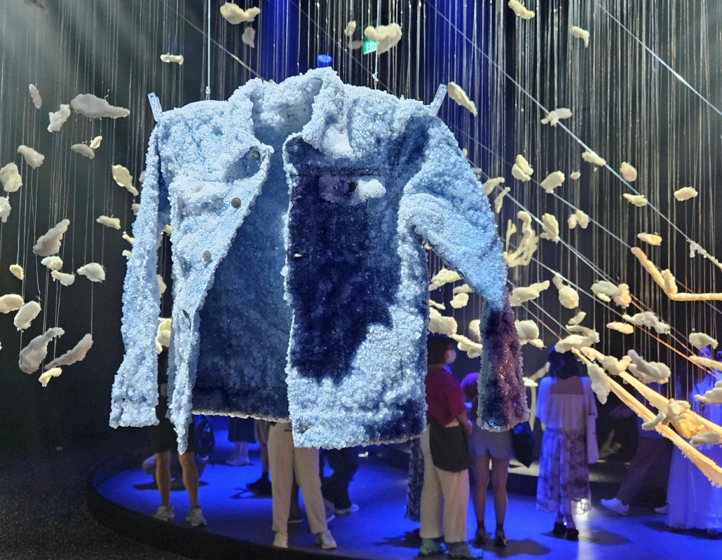許倬爾以電影《天若有情》為主題,將電影主角華Dee的牛仔褸化身為結晶藝術。(香港中通社記者 黃璇攝) 作為唯一一位參與創作的女藝術家許倬爾,她以經典電影《天若有情》為主題,創作一系列象徵愛情的結晶藝術,包括華Dee的牛仔褸、電單車、頭盔,以及女主角Jojo所穿的婚紗等。劉德華亦表示結晶藝術,在今次一眾展品中最具挑戰。“因為製作結晶藝術品的不確定性很高,我們只能給它時間和溫度自己去形成,成品如何我們不能預料,所以這件藝術品的生命力特別強。”而許倬爾接受訪問時也頗有感觸:“我想(藉作品)表達愛情很美麗、很誘人,它象徵著永恆但其實非常脆弱。水晶其實很鋒利,我在創作時手上被割得都是傷。但我不能停,因為停下來只能放棄這件作品。所以給我的領悟是,你要不斷地受傷,才能擁有這個美好的東西。”