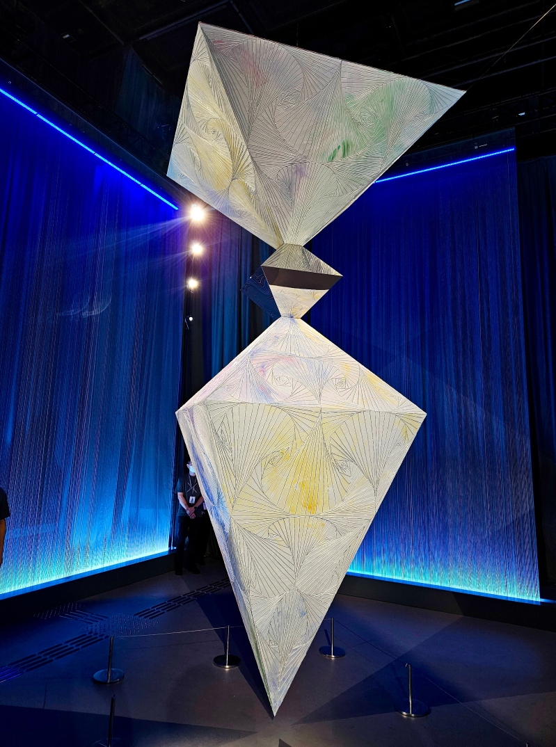 華仔跟隨林于思練習水墨畫,共同創作《從心 Be There》。(圖片:主辦方提供) 展覽分為8個展區,分別有油畫、大型裝置、雕塑、書法、水墨畫、幾何紙雕、結晶裝置等藝術展品,其中以《沿途 All Along》為題的作品,以模擬真實演唱會上的舞台效果,還原劉德華演唱會的表演舞台。結晶裝置則以藝術形式展現電影《天若有情》場景,另外劉德華的代表作電影《大隻佬》就利用幾何紙雕藝術製作而成。