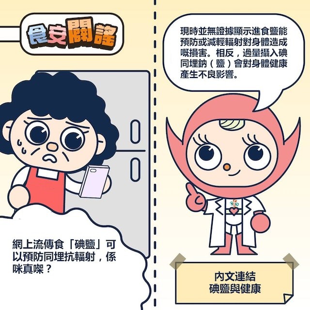 (圖源:澳門經科局) 食物安全專員黃宏亦說,食用“碘鹽”無法抗輻射,成人每日鹽攝取量建議最多5克,即約一茶匙,攝取過多鹽會造成高血壓和中風風險。呼籲市民不應囤積,亦應盡量控制鹽攝取量。